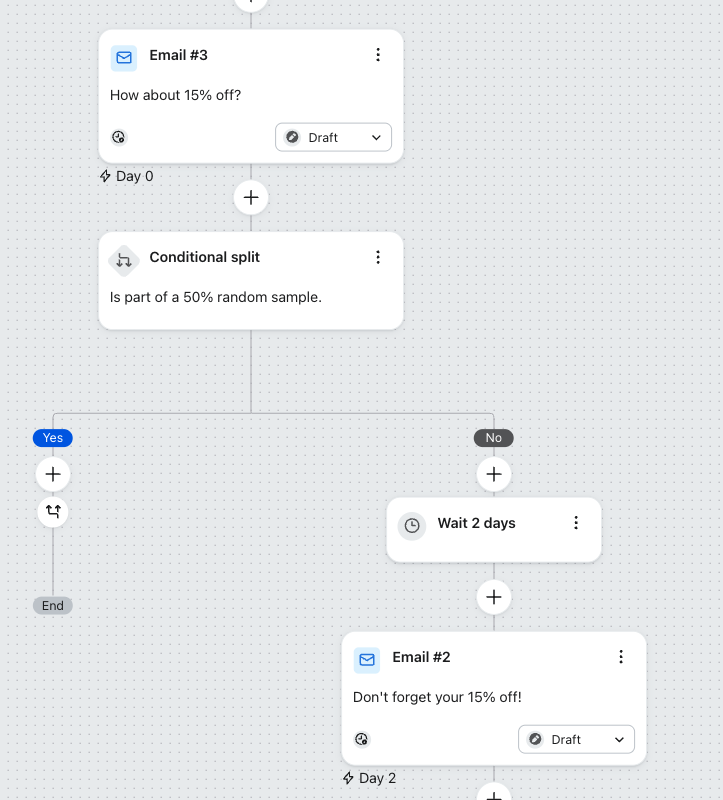 Ad esempio, potrebbe voler testare l'invio di un'email aggiuntiva ad un ramo della sua serie di benvenuto. Per farlo, deve trascinare una divisione alla fine del flusso, aggiungere un ritardo temporale e poi configurare il contenuto dell'e-mail.