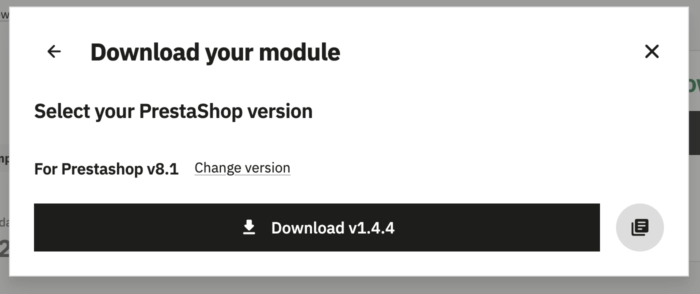 3. Nella pagina del modulo, fai clic su Download (Scarica). Convalida i tuoi dati se necessario, quindi seleziona la versione di PrestaShop che stai utilizzando e scarica il file zip. Non è necessario estrarre il file zip.