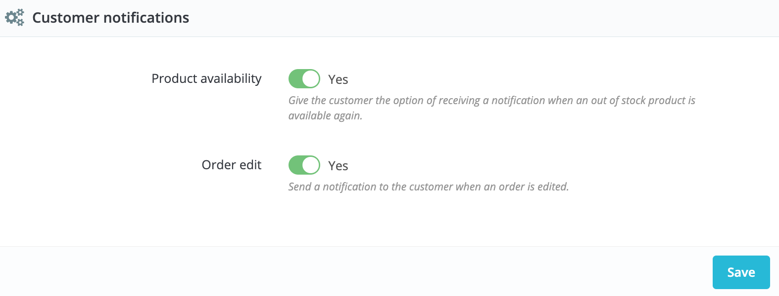 15. Alla voce Nuovamente disponibile vedrai il selettore delle Notifiche via e-mail, che abilita l'accesso all'invio di e-mail per i prodotti nuovamente disponibili su Klaviyo. Per poter abilitare questo selettore, dovrai aver installato il modulo degli avvisi via e-mail in PrestaShop e aver attivato la disponibilità dei prodotti: