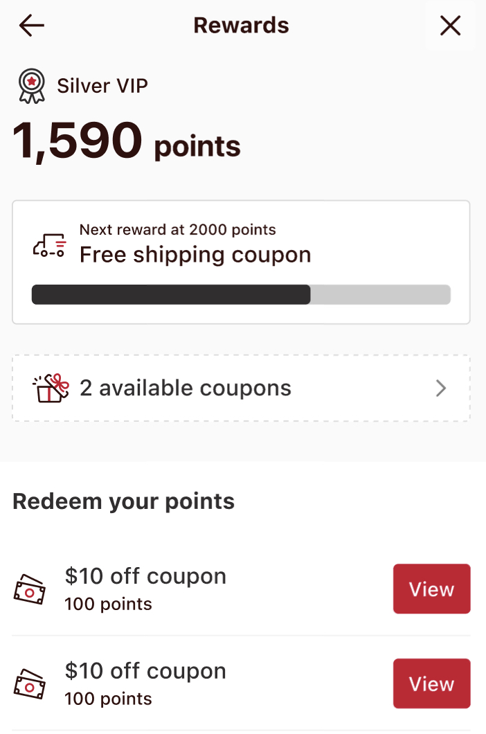 - Accedi a un'anteprima dei coupon e dei premi disponibili, che si espande alla pagina completa dei premi quando si clicca.
