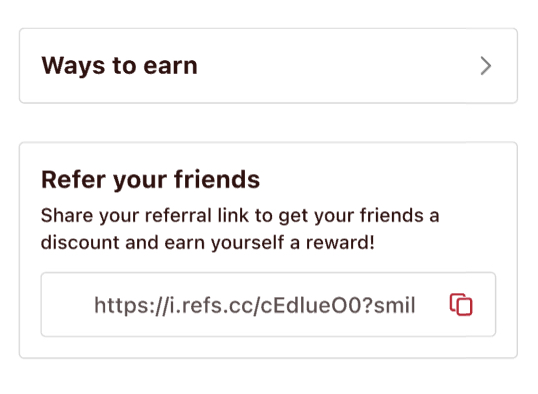 I clienti possono anche trovare il loro link individuale ai nuovi clienti presentati (referral) e un menu espandibile "Modi per guadagnare" sotto i premi e i coupon riscattabili. Il menu "Modi per guadagnare" mostra le opzioni di guadagno che hai configurato in Smile.io. Nota che puoi modificare queste opzioni di guadagno solo su Smile.io, non nelle impostazioni di Klaviyo Customer Hub.