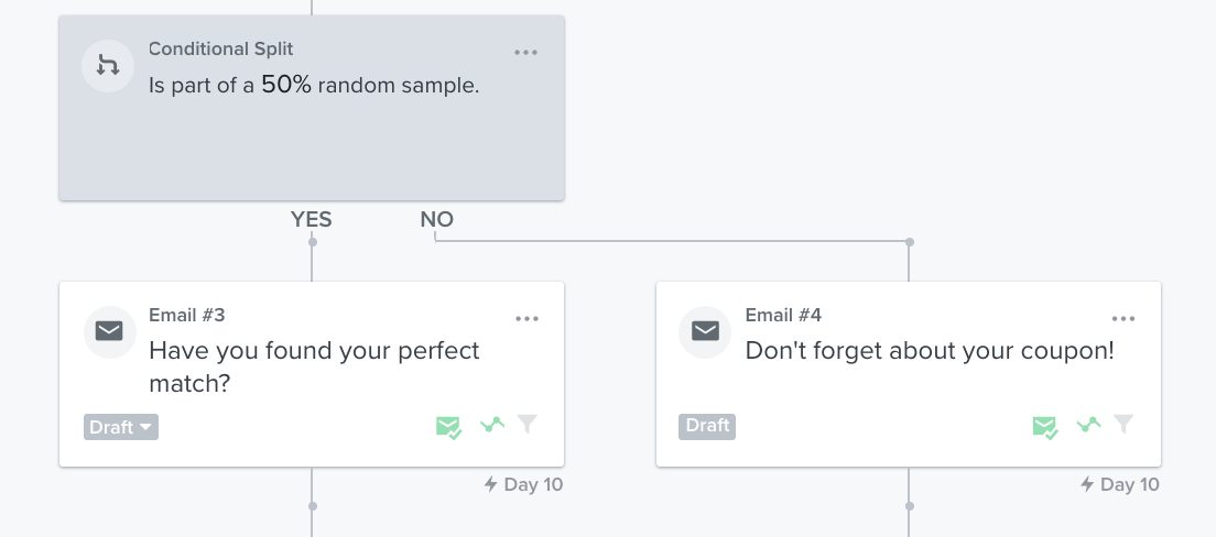 Gli split le permettono anche di eseguire dei test A/B. Utilizzi una divisione condizionale per creare un campione casuale con una divisione 50/50, e poi testi 1 variabile alla volta. Può testare la tempistica, il contenuto, il posizionamento dei link e molto altro ancora per capire cosa preferisce il suo pubblico. Poi, applichi questi insegnamenti ad altri messaggi e campagne di flusso per vedere se produce una risposta simile. Tenga presente che dovrà controllare manualmente i risultati del test e decidere quale si comporta meglio.