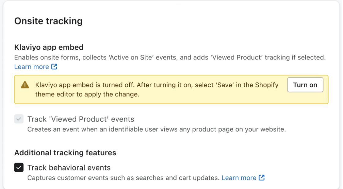 Il tracciamento sul sito di Klaviyo viene abilitato quando si attiva la nostra integrazione app in Shopify. Assicurati che le impostazioni dedicate siano selezionate in Klaviyo. Tracciamo i seguenti eventi: