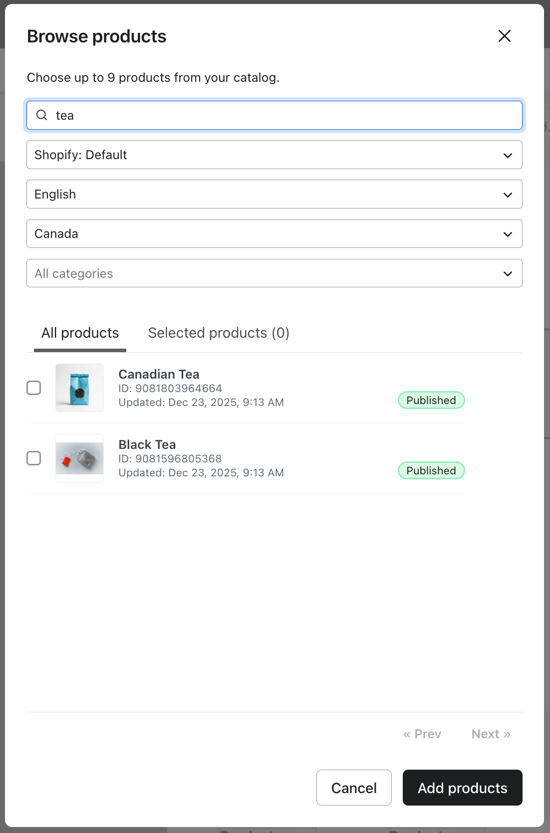 - Dal selettore del blocco di prodotti statici, scegli un catalogo che tenga conto delle impostazioni locali. Per l'integrazione di Shopify, il nome del catalogo è "Shopify: predefinito"