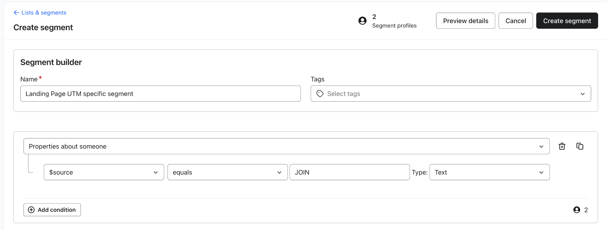 - Crea segmenti o flussi mirati per gli iscritti che hanno effettuato l'iscrizione dalla landing page. Utilizza l'evento Iscrizione all'elenco o Modulo inviato dal profilo e filtra in base al valore di origine associato a quella landing page.