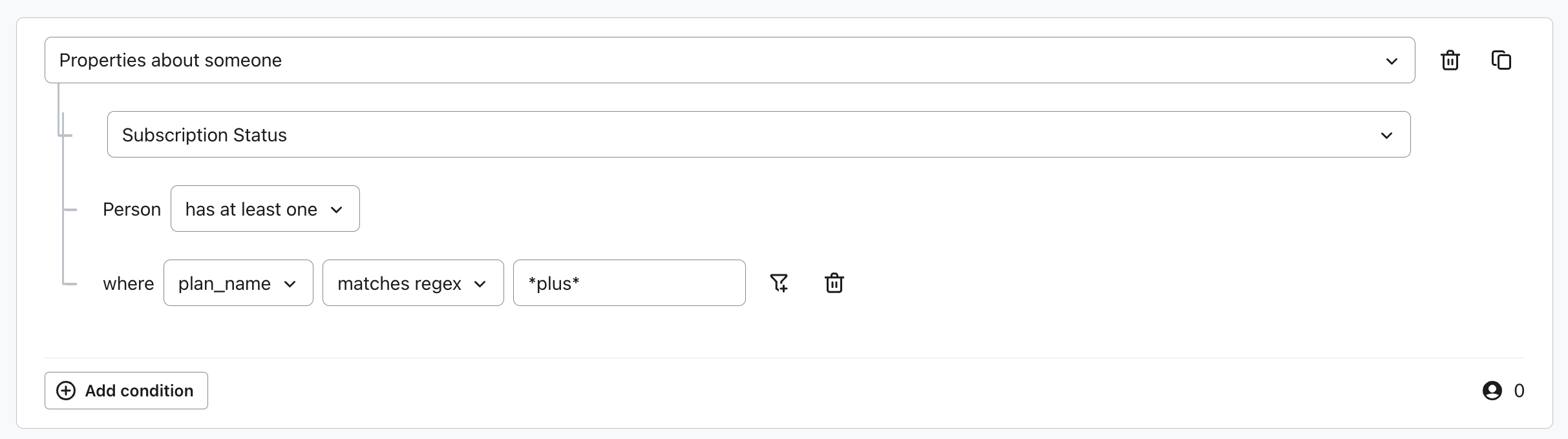 La corrispondenza regex ti consente di filtrare i profili in base ai pattern di testo invece che ai valori esatti. Questo metodo è utile per trovare i profili che seguono un formato specifico, come gli indirizzi e-mail di determinati domini o i numeri di telefono in un formato specifico.