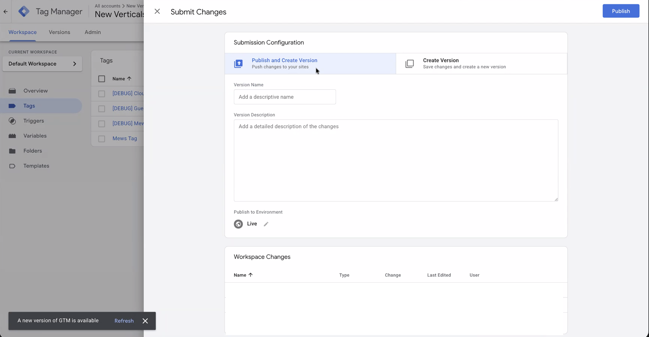Fai clic sul pulsante blu Invia nell'angolo in alto a destra di GTM.