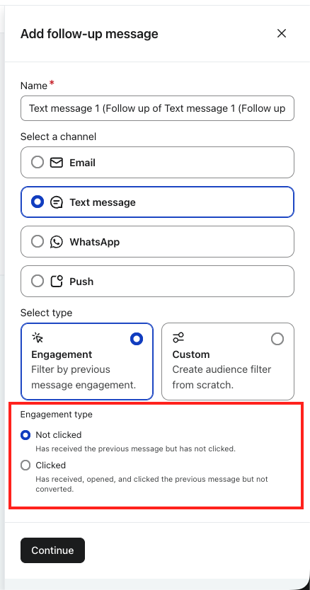 - Seleziona un tipo di follow-up: un'opzione basata sul coinvolgimento degli utenti o un filtro personalizzato.