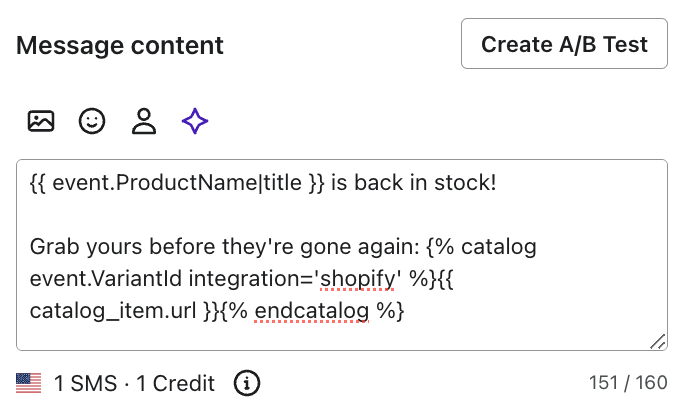 - Dopo il testo, inserisca i tag del catalogo per l'articolo che è tornato in stock.