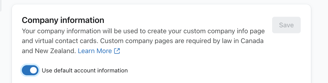 - Scorri verso il basso fino alla sezione informazioni sull'azienda. Questo verrà popolato automaticamente con le informazioni della tua azienda fornite per il tuo account, ma potrai modificare le informazioni specifiche per la scheda di contatto. Per farlo, seleziona la voce Usa le informazioni predefinite dell'account.
