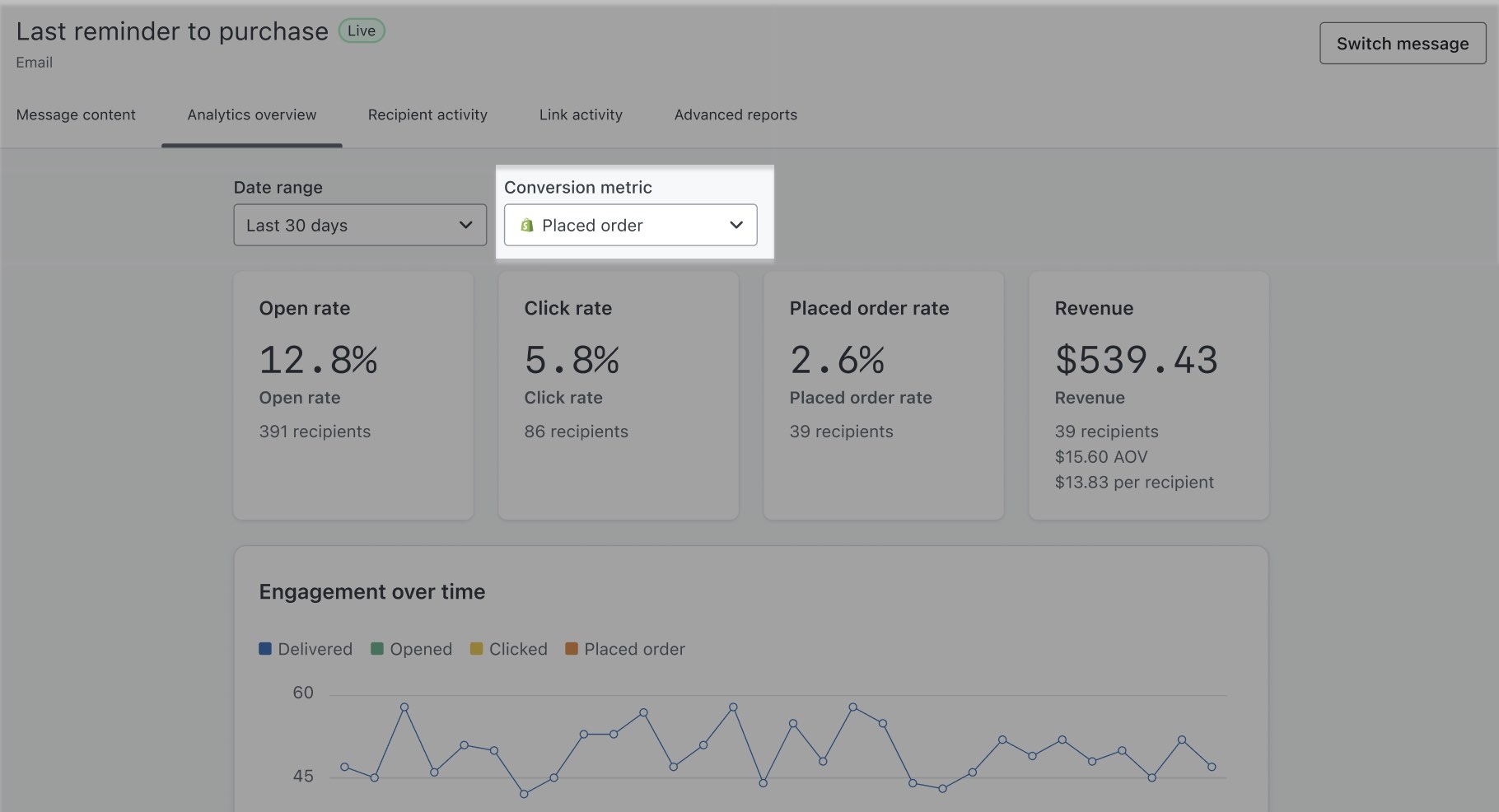 1. 아래와 같이 전환 지표 드롭다운을 사용하여 지정된 플로우 이메일에 대한 전환 지표를 전환합니다.