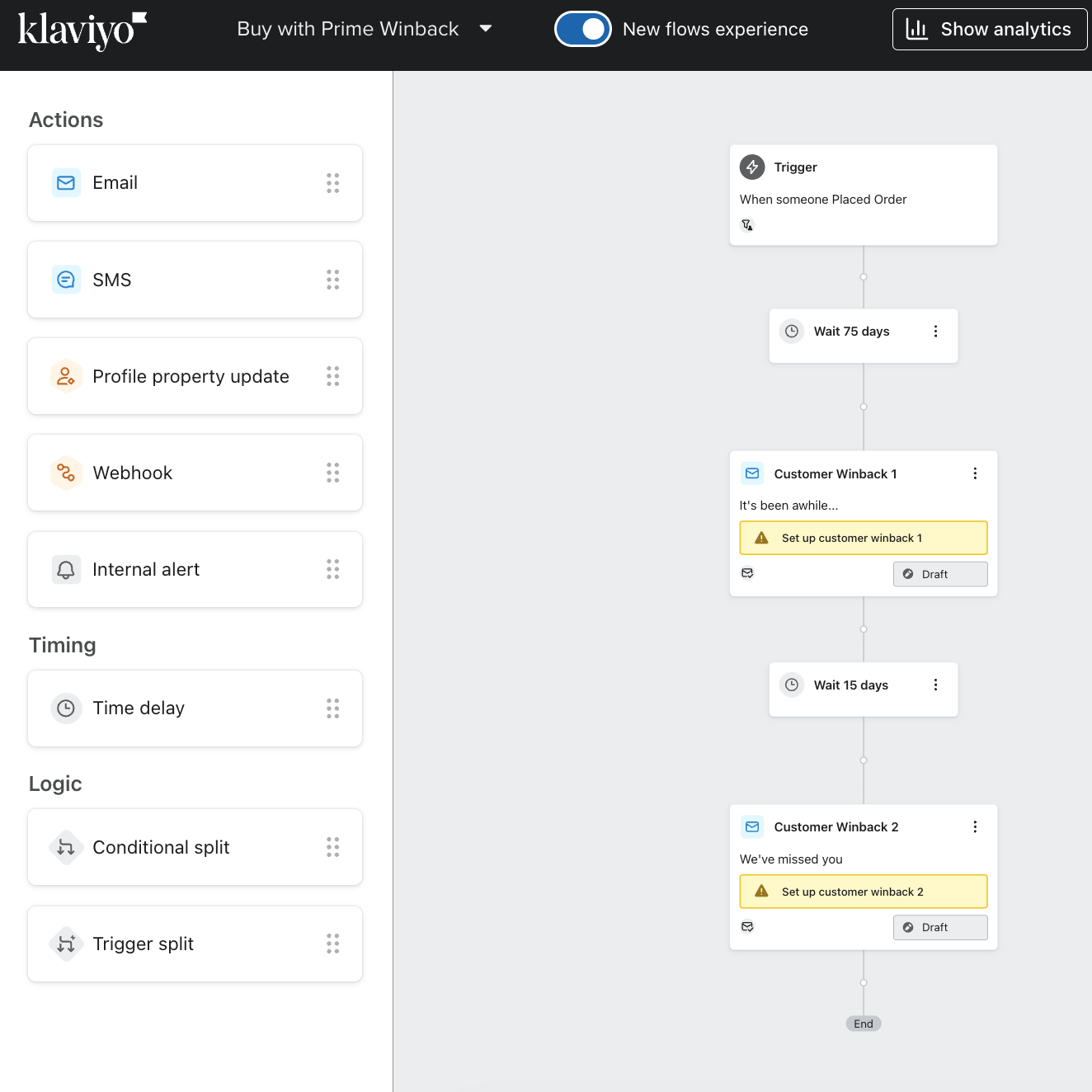 전자상거래 플랫폼의 데이터를 사용하여 이미 윈백 플로우를 생성한 경우, 원래 플로우에는 프라임으로 구매를 사용하여 원래 주문을 한 고객이 포함되지 않으므로 프라임으로 구매 데이터를 사용하여 동일한 유형의 두 번째 플로우를 생성해야 합니다. 또한 클라비요 계정에서 지금 프라임 데이터로 구매를 설명하기 위해 기존 윈백 흐름에 추가 흐름 필터를 추가하는 것이 좋습니다: