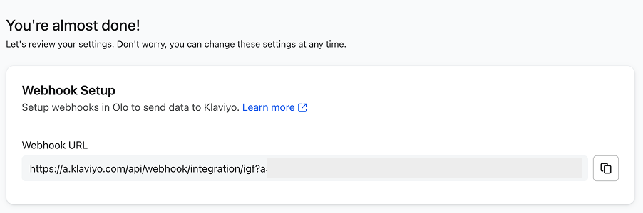- 대상 URL: Klaviyo 섹션의 7단계에서 Olo 연동 설치하기에서 복사한 URL입니다.