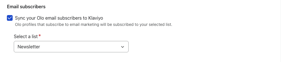- Olo 이메일 구독자를 Klaviyo 으로 동기화하도록 설정을 확인하세요. 그런 다음 드롭다운에서 기본 이메일 리스트(또는 원하는 경우 다른 리스트)를 선택합니다. 이 리스트를 단일 옵트인으로 설정하는 것이 좋습니다.