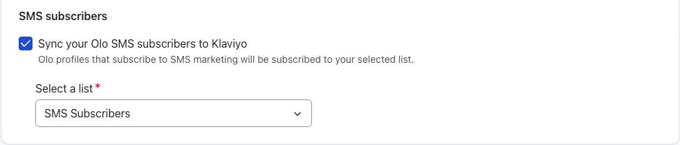 - Olo SMS 구독자를 Klaviyo 에 동기화하도록 설정을 확인합니다. 그런 다음 드롭다운에서 기본 SMS 리스트(또는 원하는 경우 다른 리스트)를 선택합니다.