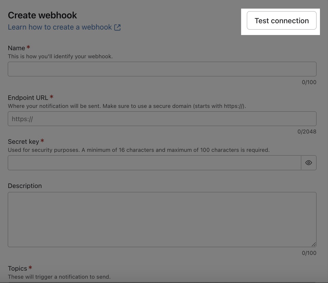 Klaviyo 에서 웹훅을 설정할 때, 연결이 정상적으로 작동하는지 확인하기 위해 테스트할 수 있습니다. 웹훅을 테스트하려면 필요한 필드를 입력한 후 '연결 테스트' 버튼을 클릭하세요.
