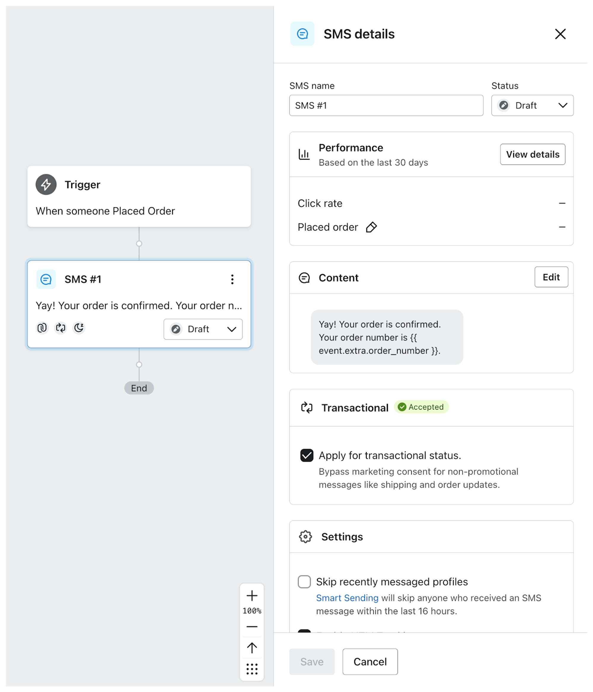 - 예 경로에서 SMS 메시지를 추가하고 메시지를 작성하여 프로모션 콘텐츠를 포함하거나 메시지를 트랜잭션으로 표시합니다.