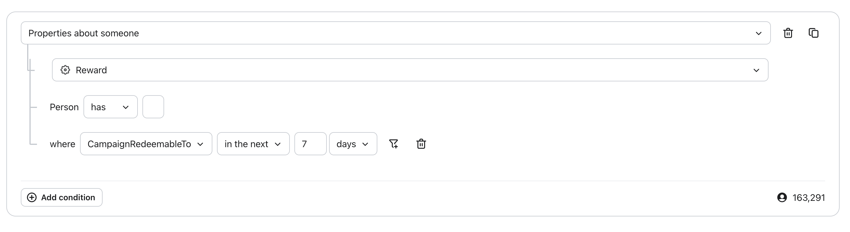예를 들어, 객체를 사용하면 다음 7일 이내에 만료되는 보상을 받은 게스트 세그먼트를 생성할 수 있다.