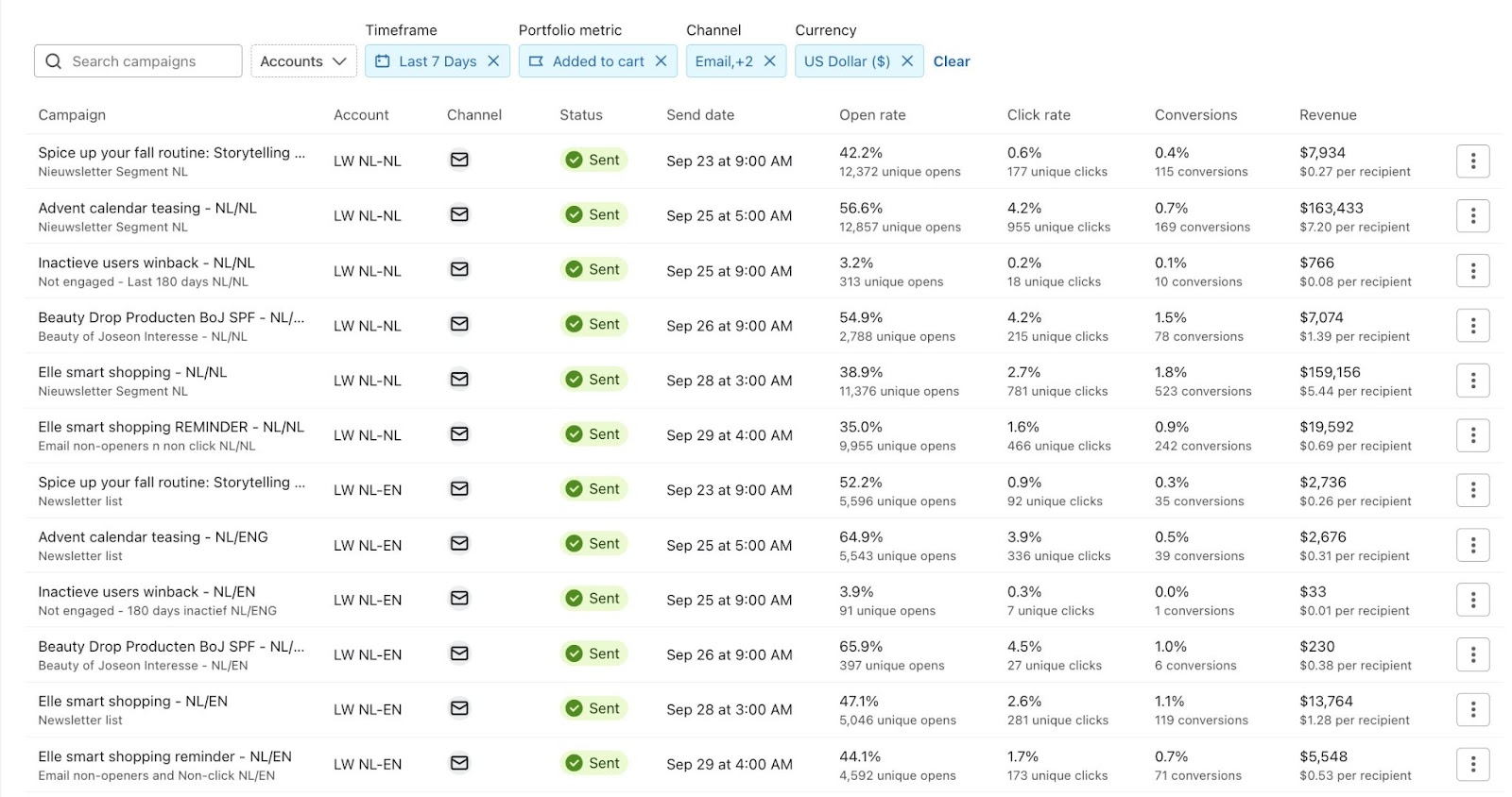 그래프 아래에서 각 계정의 캠페인 및 플로우 실적에 대한 자세한 정보가 담긴 표를 확인할 수 있습니다.