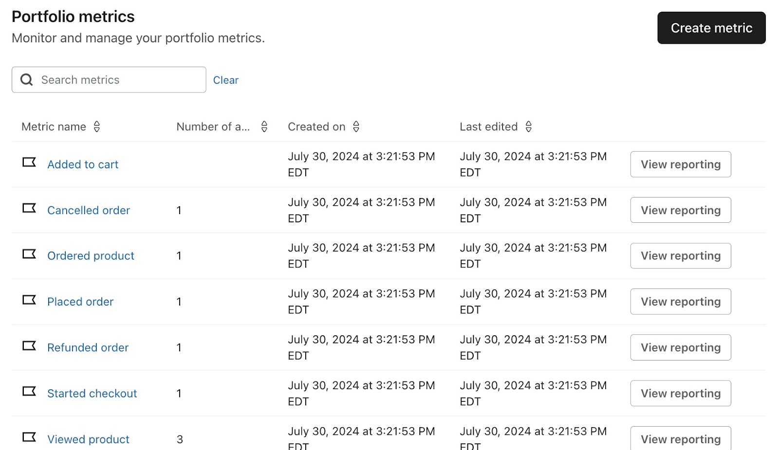 포트폴리오 매핑 지표는 각 계정에서 개별적으로 설정할 필요 없이 사전 정의된 지표(예: 주문 완료, 환불된 주문, 주문한 제품 등)를 자동으로 제공하며 필요에 따라 사용자 지정 지표 정의를 설정하는 옵션도 제공합니다.