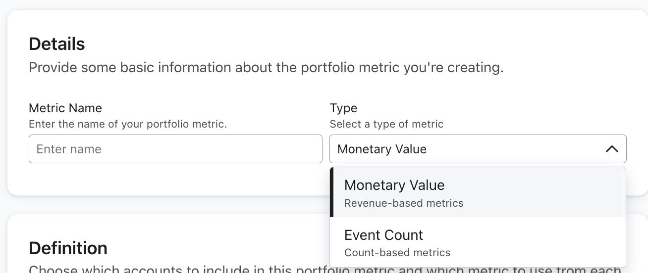 - 유형 필드에서 지표의 값을 어떻게 표현할지 선택합니다. 수익을 캡처하여 표현하는 지표에는 금전적 가치를 사용하고, 수치로 합산하는 지표에는 이벤트 수를 사용합니다.