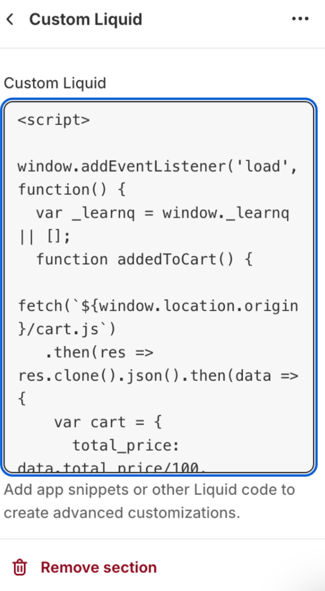 _learnq.푸시(['track', '장바구니에 추가', cart])줄을 찾아보세요. - 블록을 선택했으면 섹션 제거를 클릭합니다.