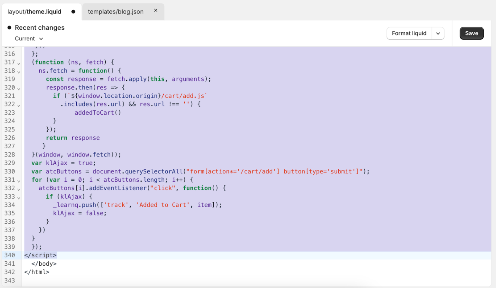 - 스토어에 사용자 지정 리퀴드 블록이 있는 경우 스니펫은 사용자 지정 리퀴드 블록에 포함됩니다.