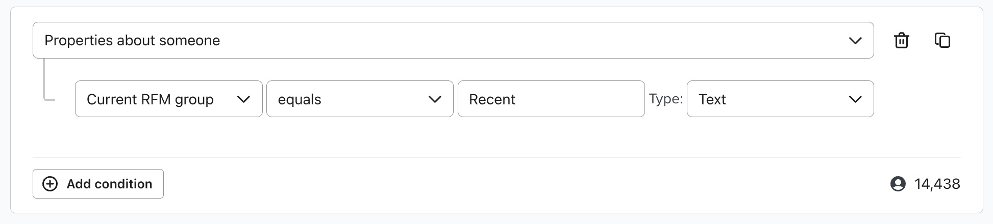 사람에 대한 속성 > 현재 RMF('가장 최근에 산 사람', '가장 구매 빈도가 높은 사람', '가장 많은 돈을 쓴 사람'으로 구매 비율을 산출하는 기법) 그룹과 같습니다. Recent