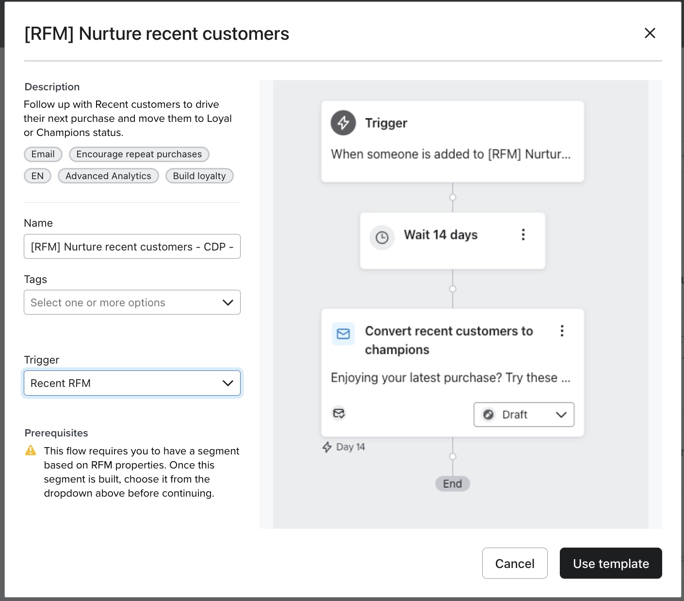 다음 고객에 대한 육성 플로우를 빠르게 생성할 수 있습니다. Recent RMF('가장 최근에 산 사람', '가장 구매 빈도가 높은 사람', '가장 많은 돈을 쓴 사람'으로 구매 비율을 산출하는 기법) 고객을 대상으로 플로우 라이브러리에서 미리 빌드된 플로우를 사용하여 빠르게 육성 플로우를 생성할 수 있습니다.