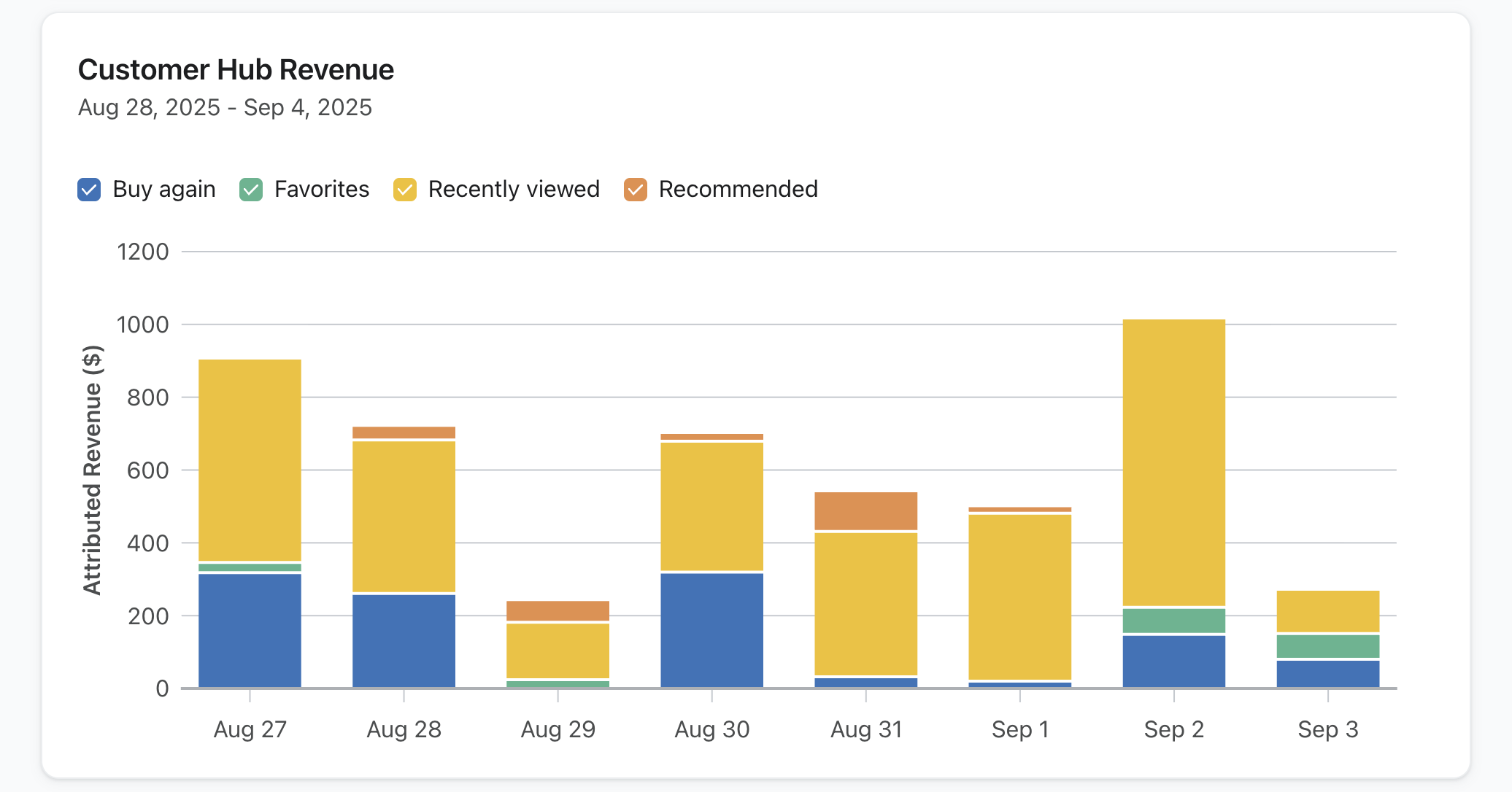 상호 작용 후 1일이 지나서 구매가 발생하거나 Klaviyo 고객 허브에서 제품과 상호 작용하지 않은 경우 주문 수익은 Klaviyo 고객 허브에 귀속되지 않습니다.