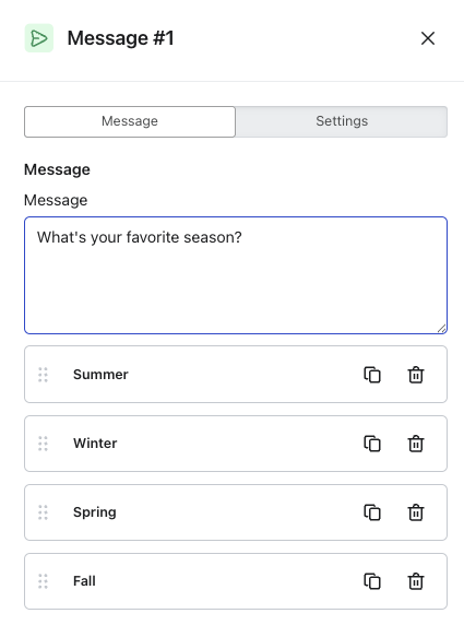 - 메시지에 최소 2개 이상의 선택 항목을 포함하세요. 참고하세요: