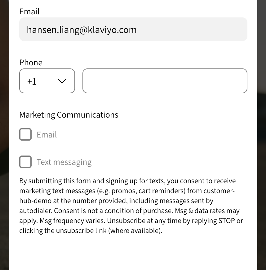 클라비요 고객 허브 인터페이스에서 이메일 또는 SMS 동의를 수집하려면 먼저 Klaviyo 계정에서 다음 단계를 완료했는지 확인하세요: