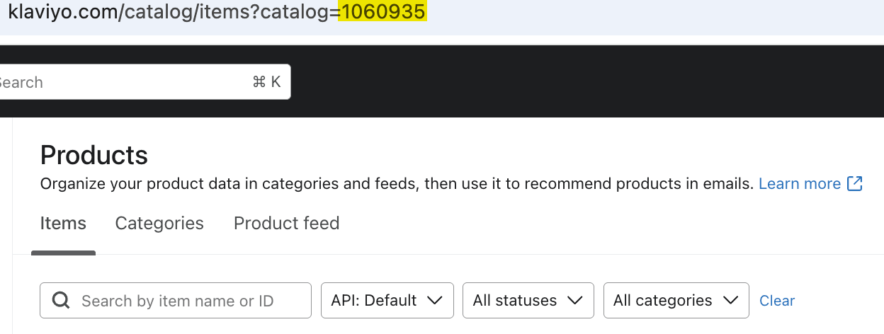 카탈로그가 여러 개 있는 경우 가져오려는 카탈로그를 지정할 수 있습니다. {{catalog id}} 태그를 사용하여 가져올 카탈로그를 지정할 수 있습니다. 예를 들어 Klaviyo 연동(예: Shopify)을 통해 동기화된 카탈로그, API 를 통해 동기화된 카탈로그 또는 사용자 지정 카탈로그 피드가 있을 수 있습니다. 태그 세부 정보는 연동 여부에 따라 달라질 수 있습니다. 다음 예에서는 여러 카탈로그가 동일한 Klaviyo 계정에 동기화되어 있으며 API 카탈로그에 포함된 특정 제품에서 제품 설명을 가져오고자 합니다.