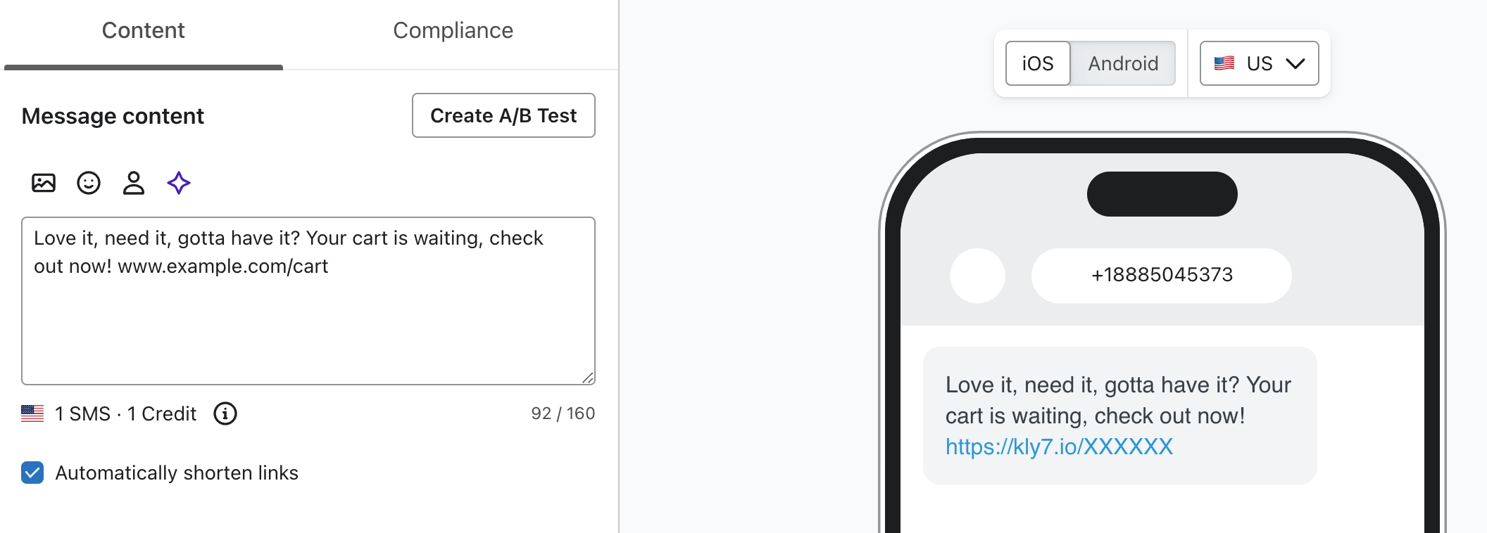 메시지 자체입니다. 공간을 절약하기 위해 메시지에 포함하는 링크를 자동으로 줄이도록 선택할 수도 있습니다(권장). 수익이 SMS로 귀속되려면 Klaviyo 링크 단축기를 사용해야 합니다. 또한 이미지를 추가하면 메시지가 MMS가 되어 청구 요금제에 따라 3건의 전송으로 계산됩니다. -