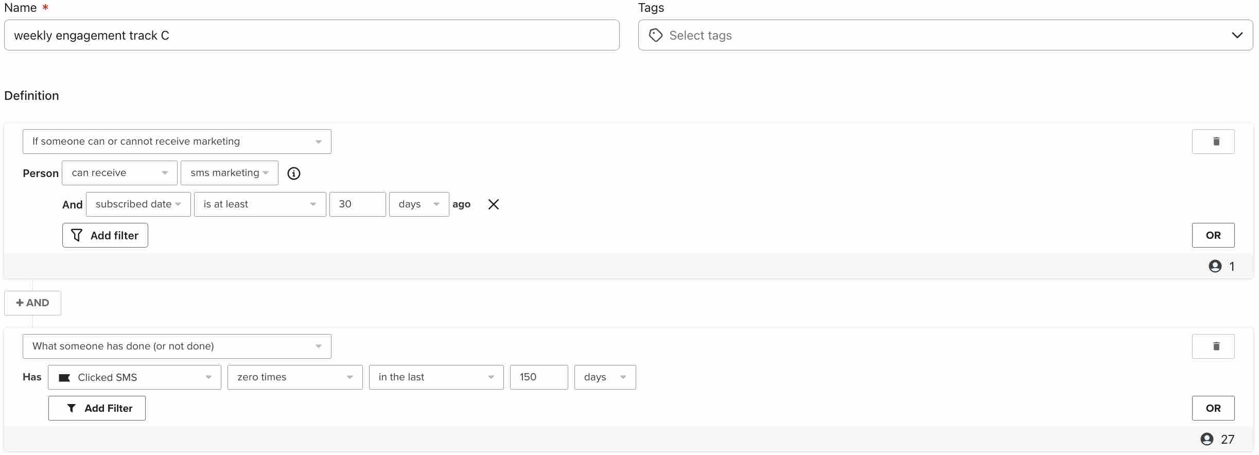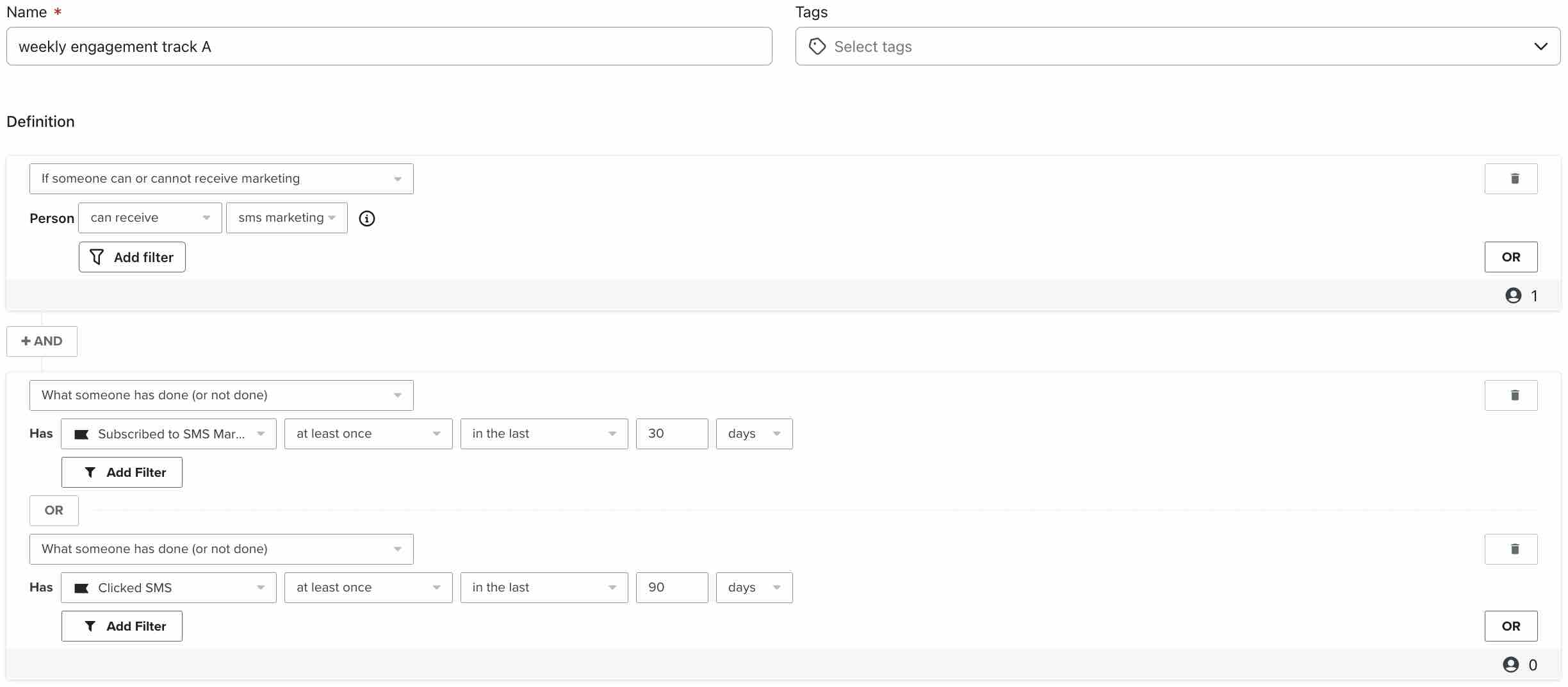 AND - 누군가가 한 일 > 지난 30일 동안 SMS 마케팅 > 을 한 번 이상 > 구독했습니다.