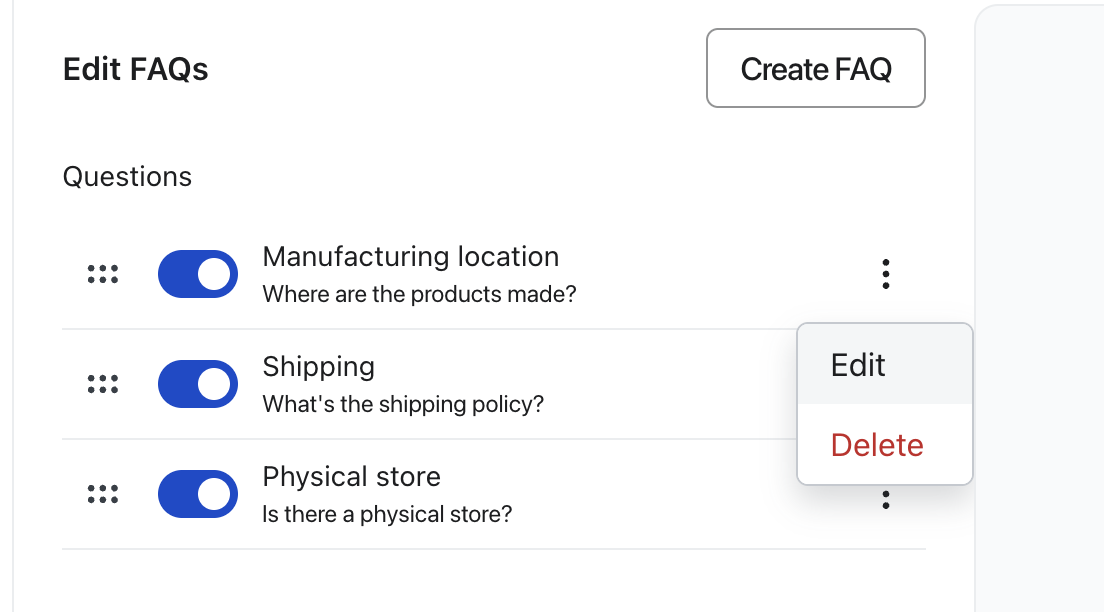- 수정하려는 FAQ 옆의 추가 옵션(점 3개) 메뉴를 선택한 다음 편집을 선택합니다.