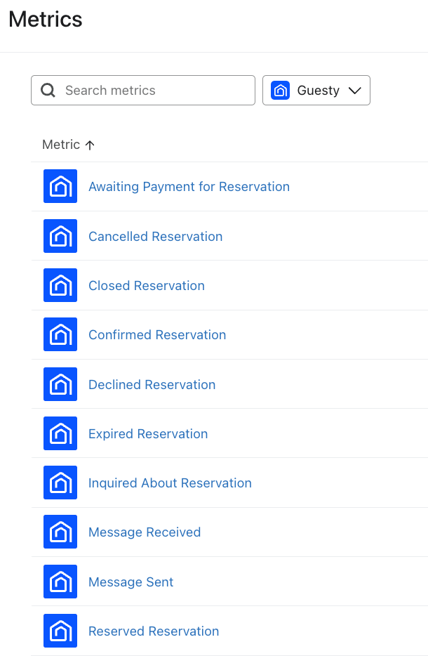 - 여기에서 계정의 모든 지표를 확인할 수 있습니다. Guesty 아이콘이 있는 지표는 Guesty 연동에서 동기화된 모든 지표를 나타냅니다.