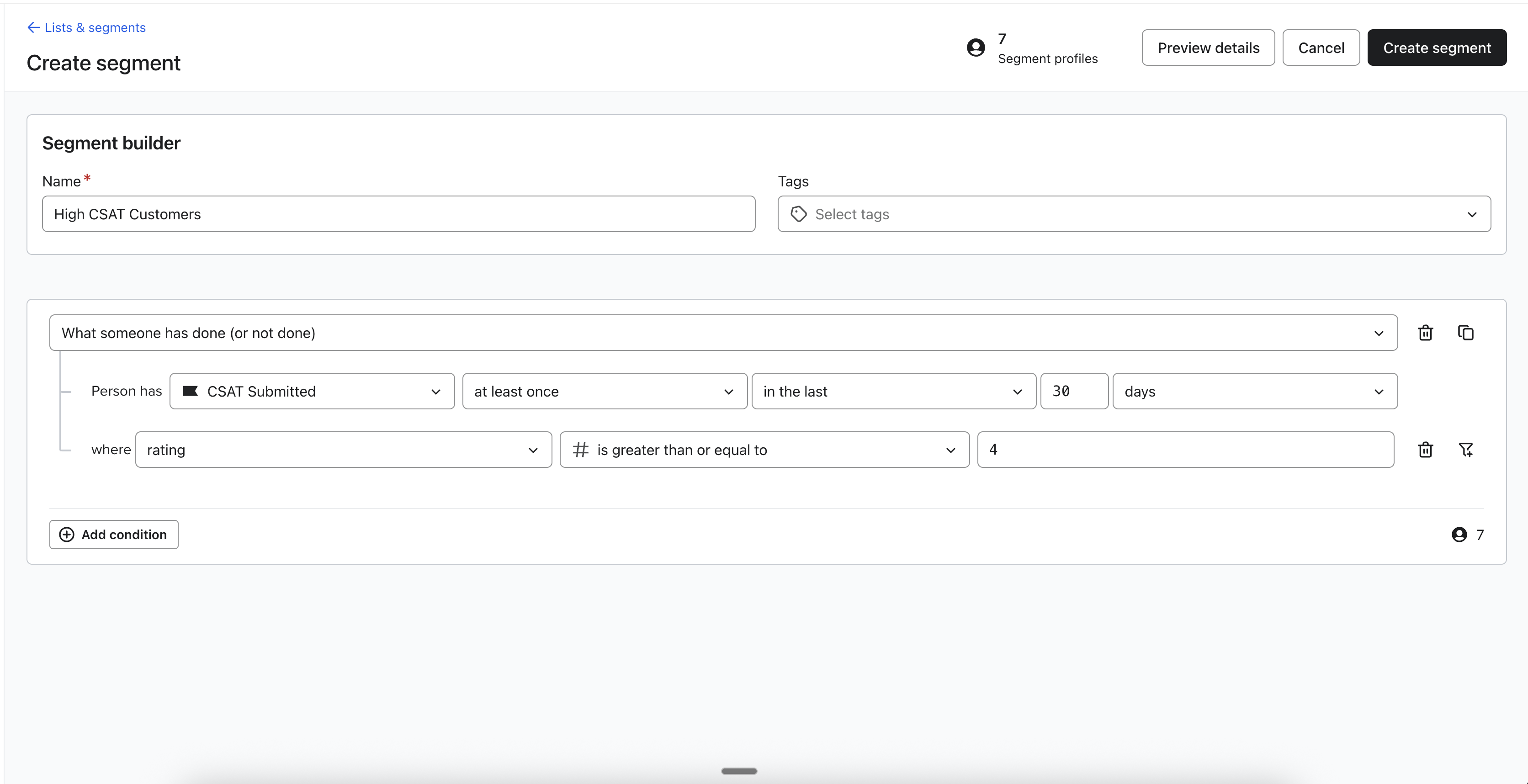 - 세그먼트를 만듭니다: "지난 30일 동안 평점 4점 이상"