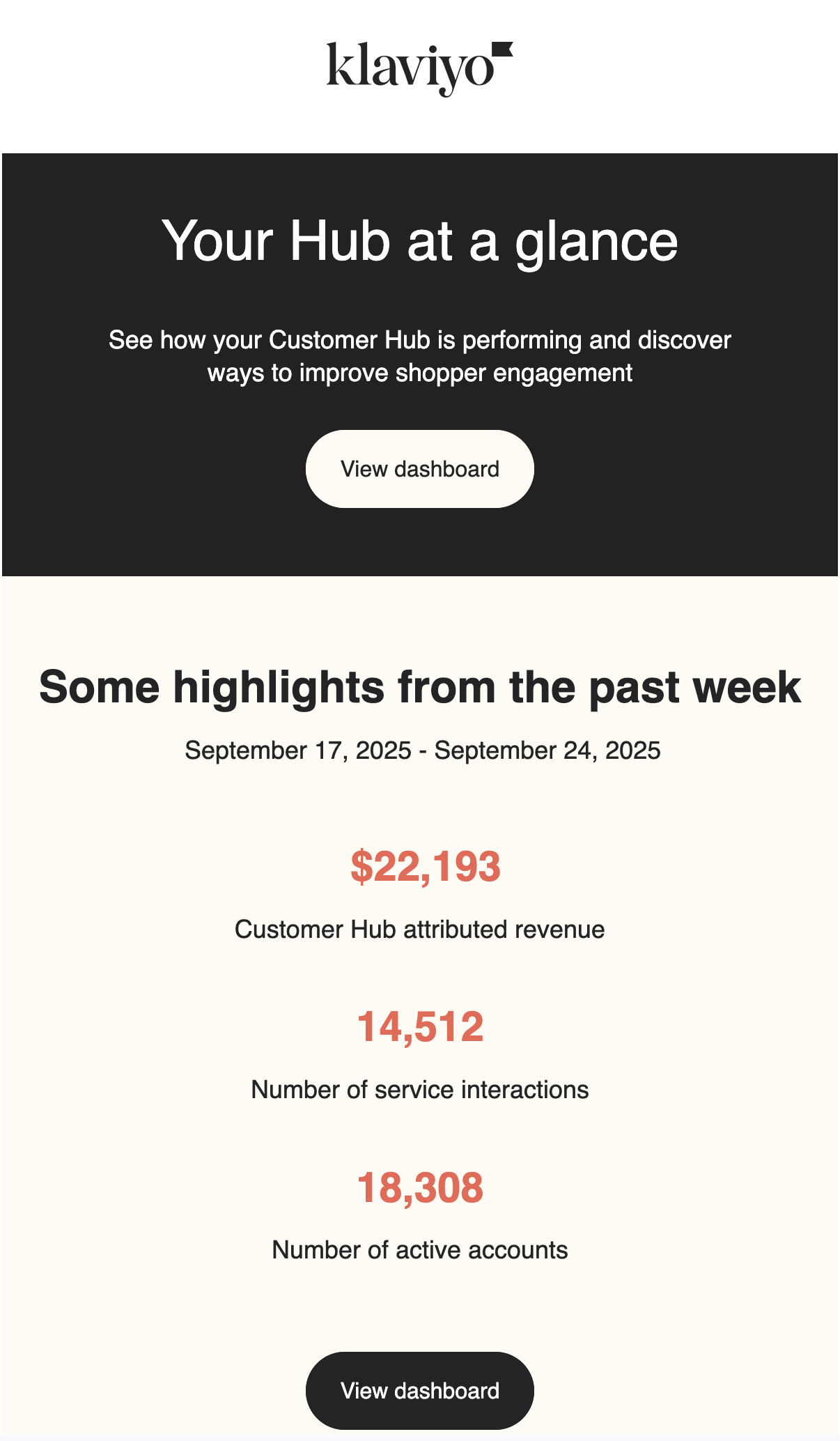 성능 요약 이메일에는 클라비요 고객 허브 대시보드에 표시되는 지표의 하위 집합이 포함되어 있습니다.