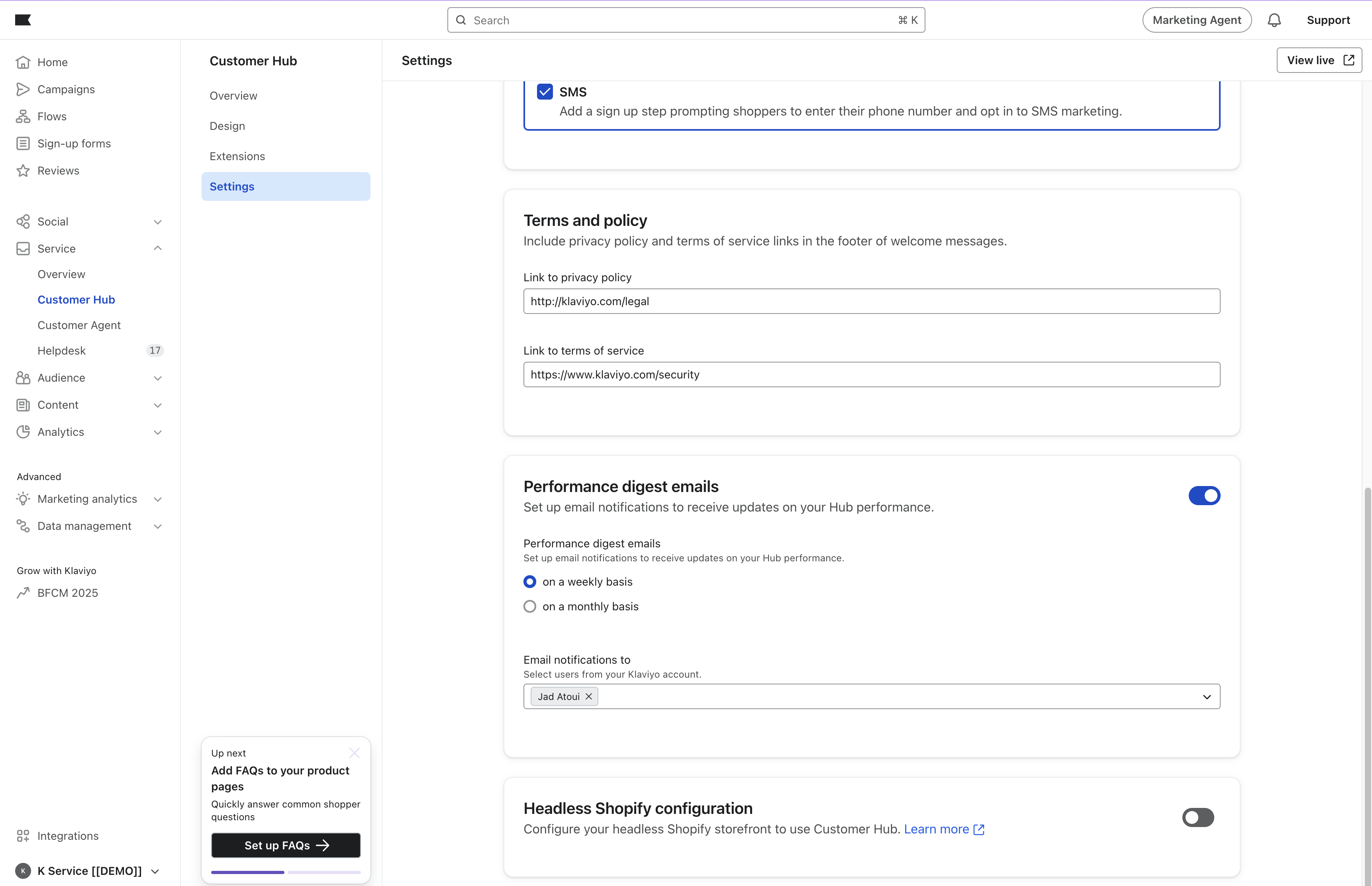 Klaviyo 의 기본 탐색 모음에서 다음으로 이동합니다: 서비스 - 클라비요 고객 허브 - 설정으로 이동합니다. 아래로 스크롤하여 "성능 요약 이메일" 을 확인합니다.