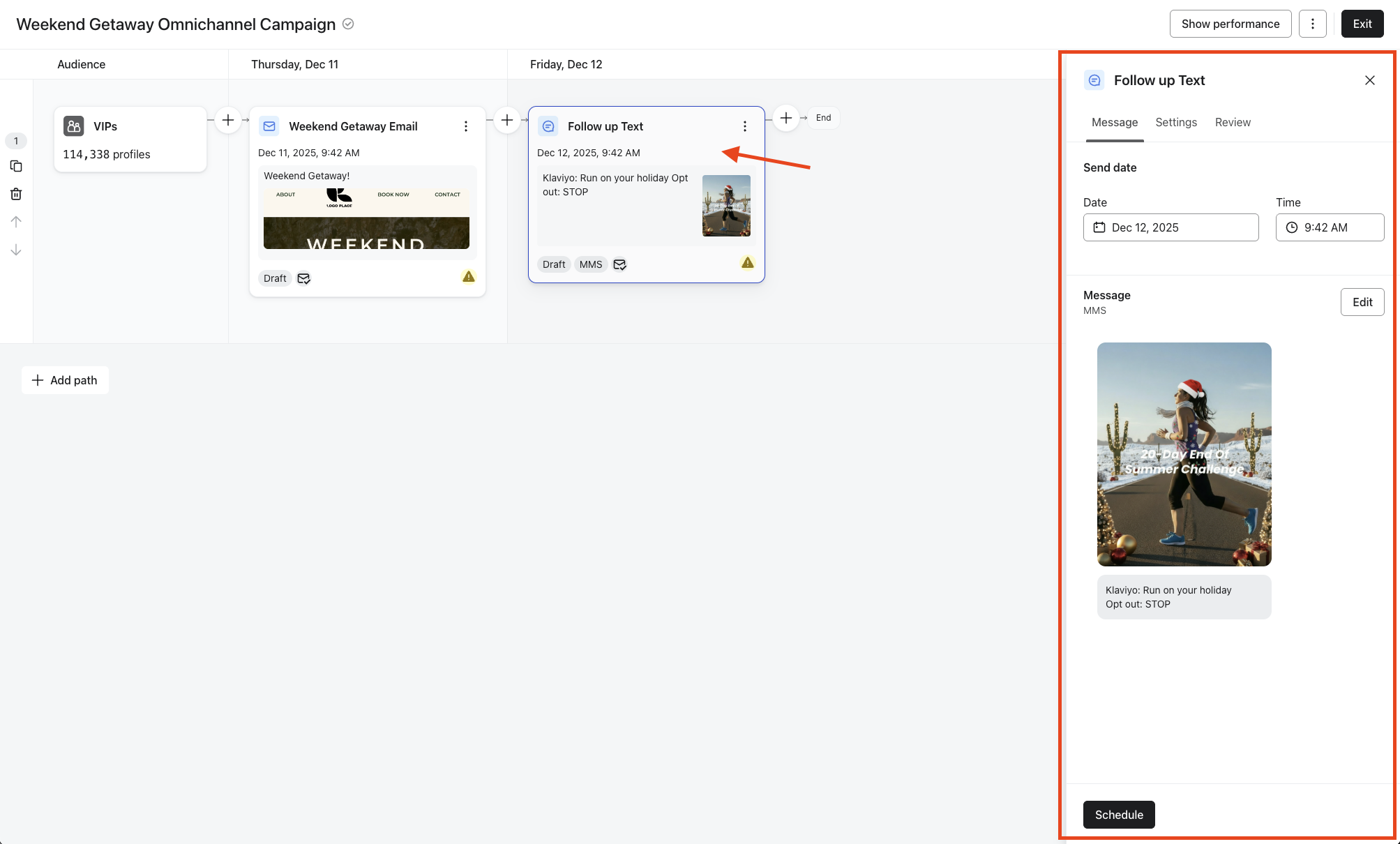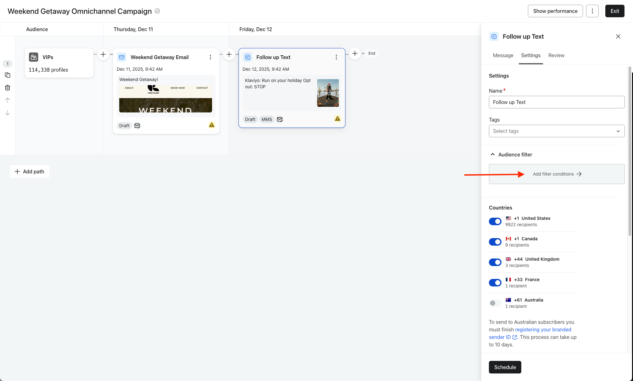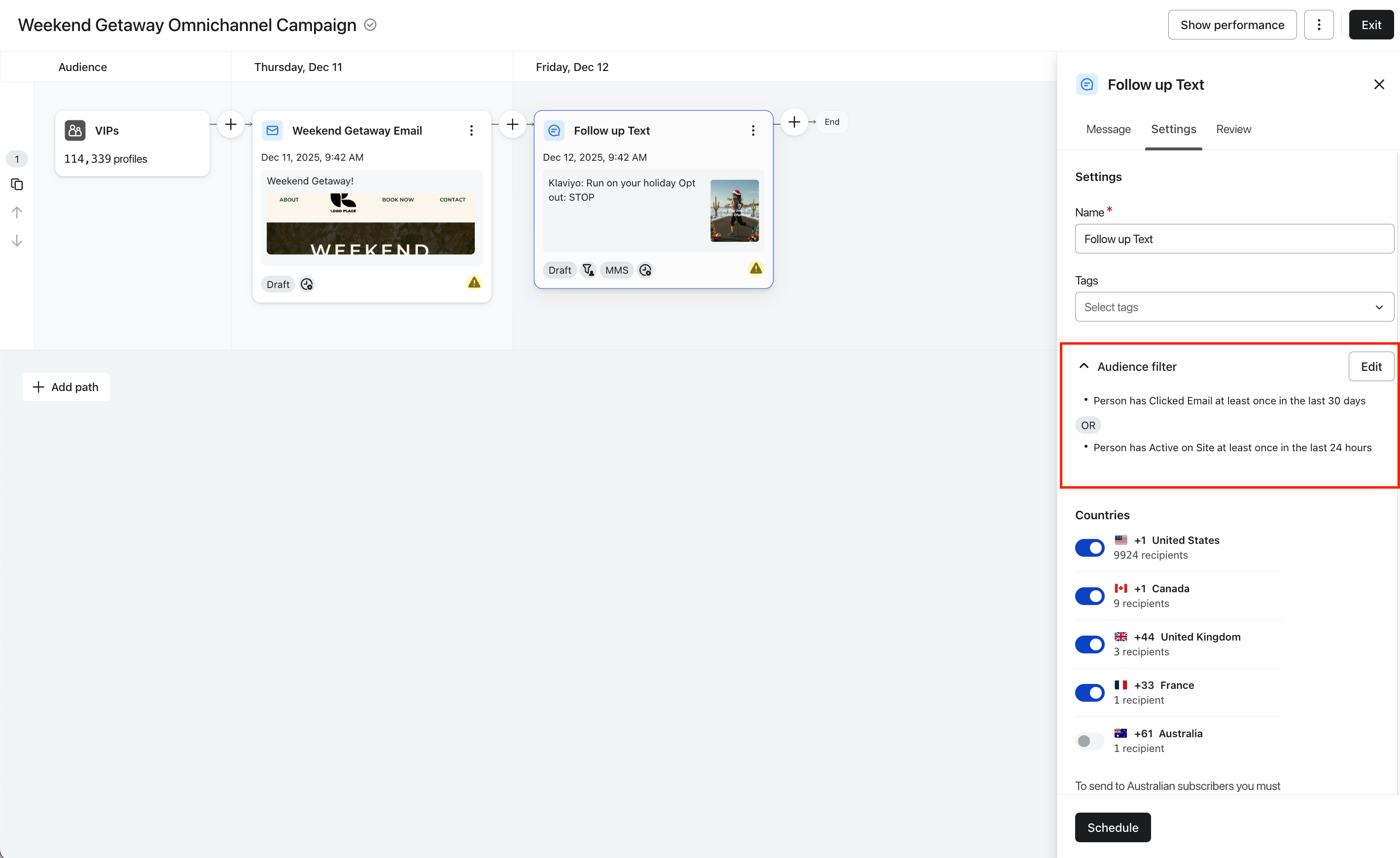 오디언스 필터를 통해 옴니채널 캠페인의 각 메시지에 대해 특정 고객 하위 세그먼트를 타겟팅하는 방법을 알아보세요. 이러한 특정 그룹을 타겟팅하면 적시에 적절한 채널에서 적절한 메시지를 전달할 수 있습니다. 결과적으로 캠페인이 더욱 개인화되고 시간이 지남에 따라 참여를 유도할 수 있습니다.