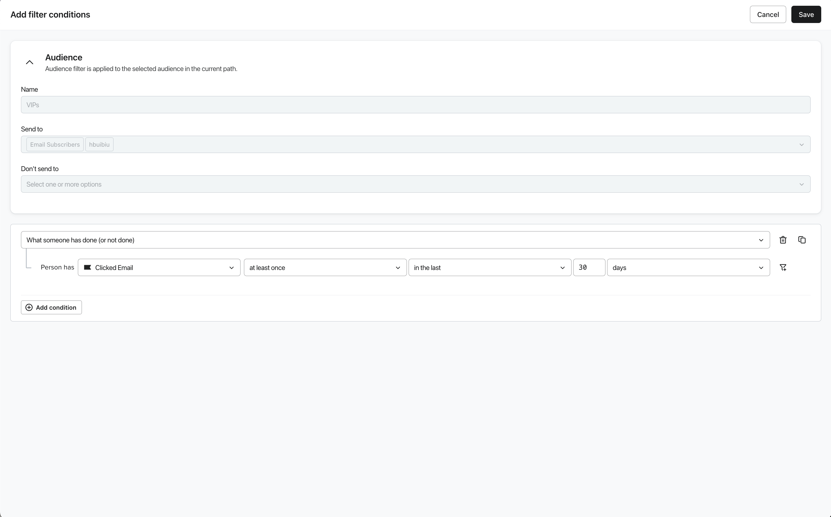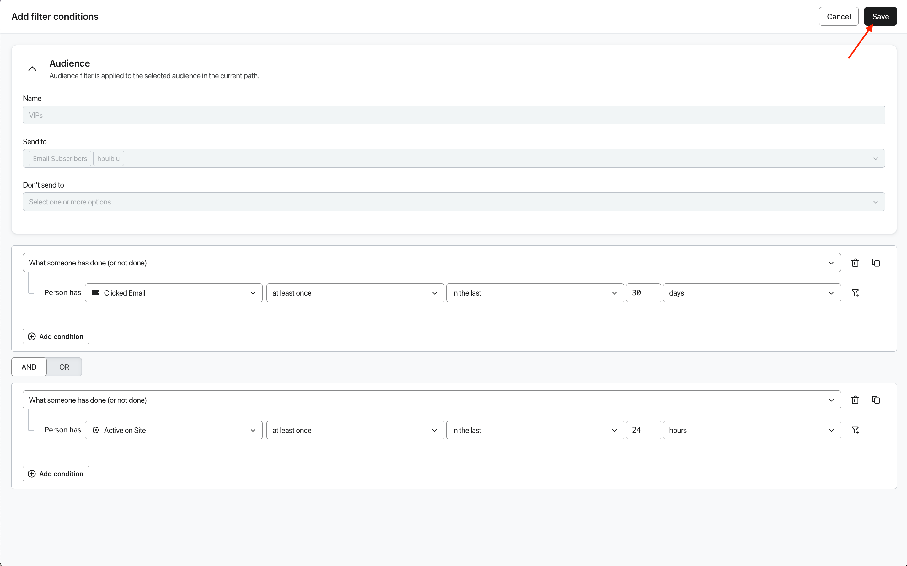 - 다음으로 필터 조건을 정의합니다. 상단에 표시되는 대상은 전체 최상위 대상이며, 추가하는 조건에 따라 이 그룹이 더 작은 타겟팅 하위 집합으로 좁혀집니다.