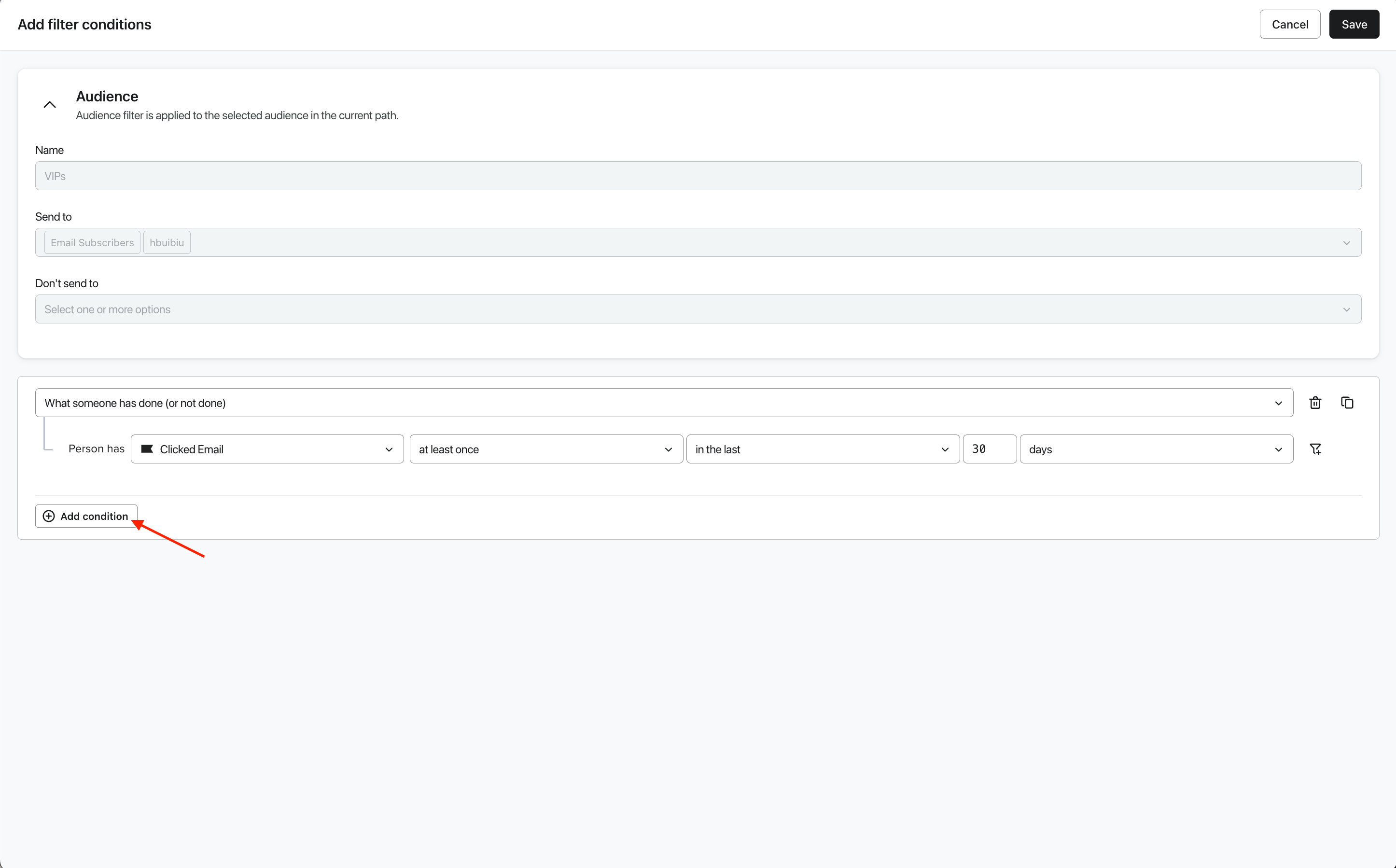 - 대상 필터 섹션에서 필터 조건 추가를클릭합니다.