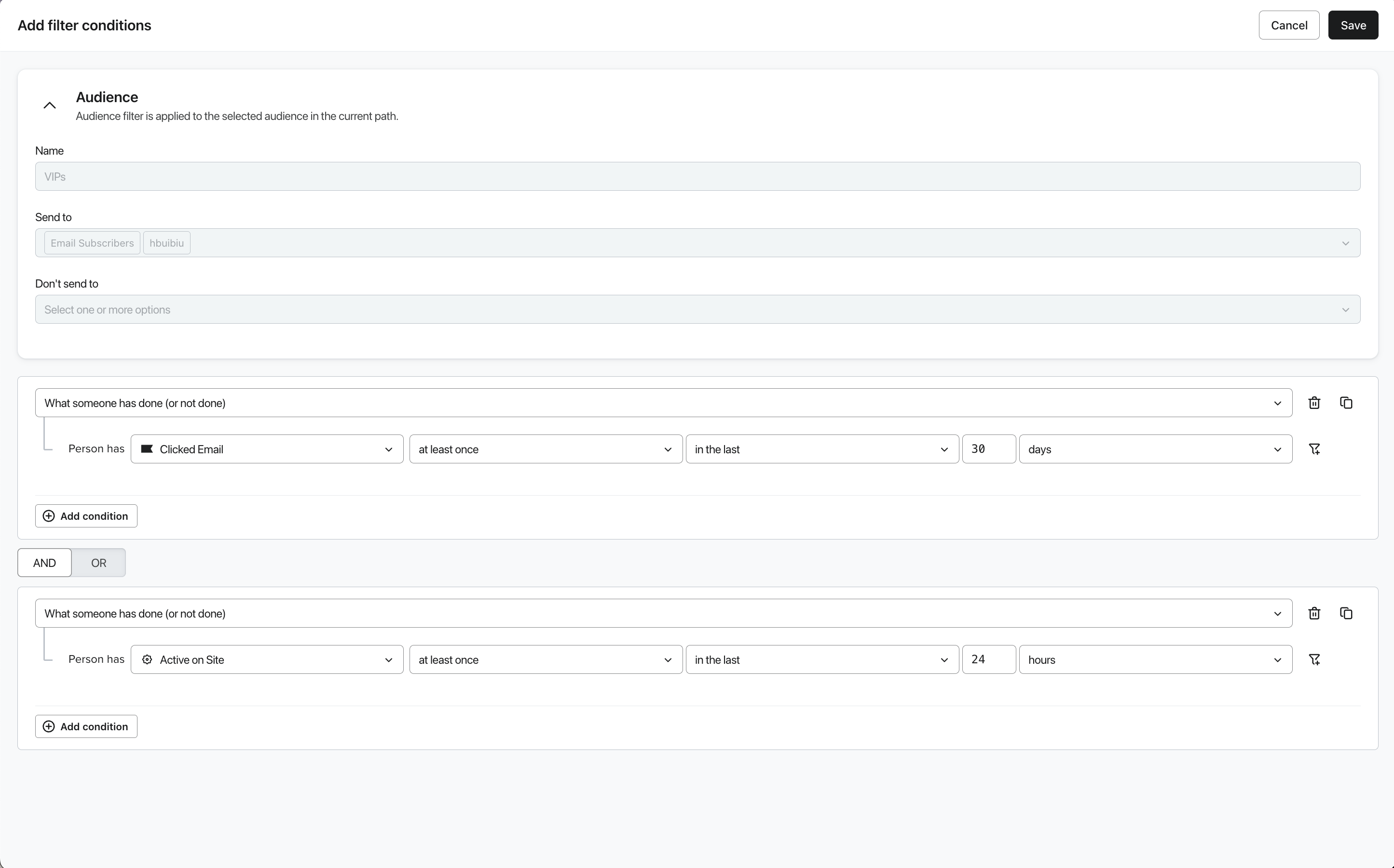오디언스 필터는 선택한 오디언스를 대상으로 범위를 좁혀 더 큰 그룹의 특정 하위 집합을 타겟팅합니다.