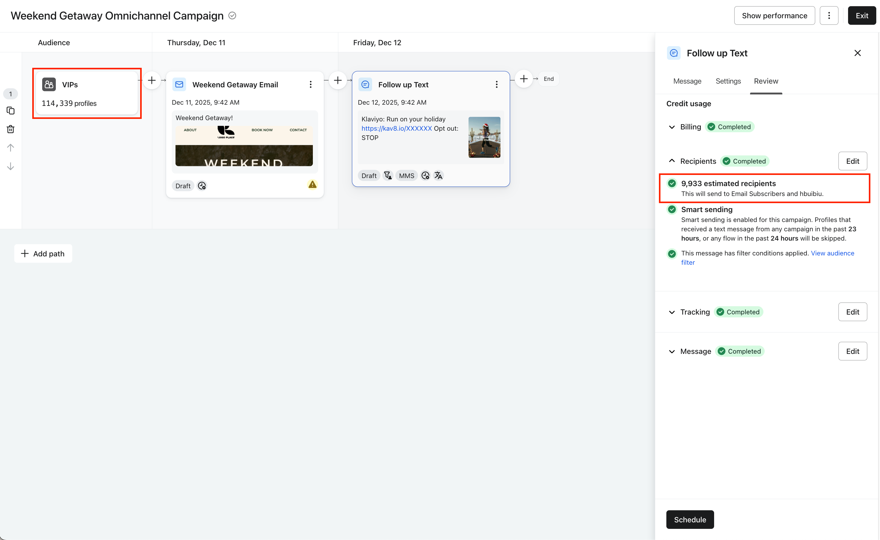 - 필터 영향을 확인하려면 검토 탭을 클릭하고 예상 수신자를 확인합니다. 이 업데이트된 숫자는 필터 기준을 충족하는 오디언스 하위 집합을 반영합니다.