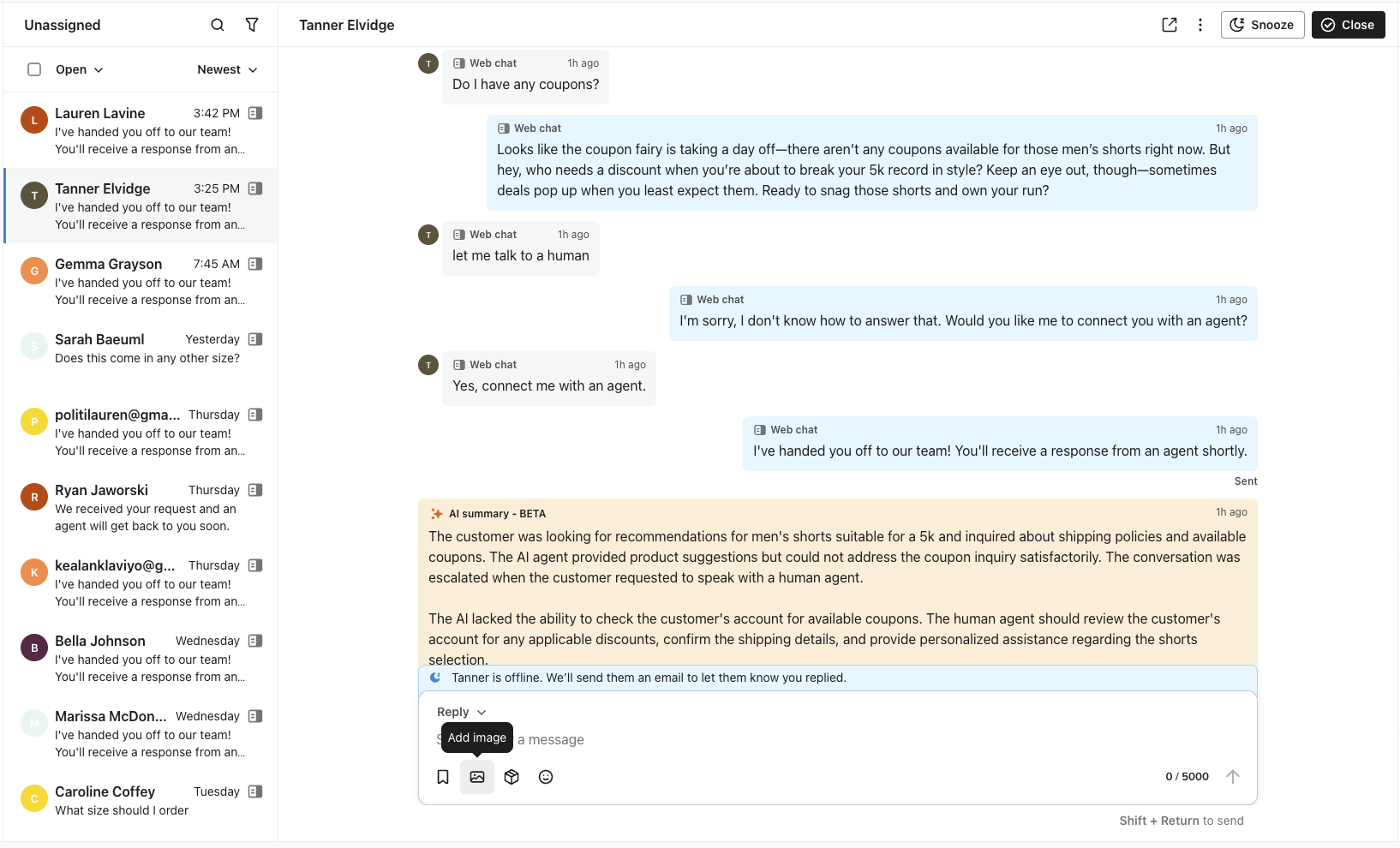 고객에게 프로세스를 안내하기 위해 스크린샷을 공유하거나, 반품 라벨을 제공하거나, 고객이 보낸 이미지를 확인해야 하는 경우 Klaviyo 헬프데스크는 여러 채널에서 리치 미디어 공유를 지원합니다.