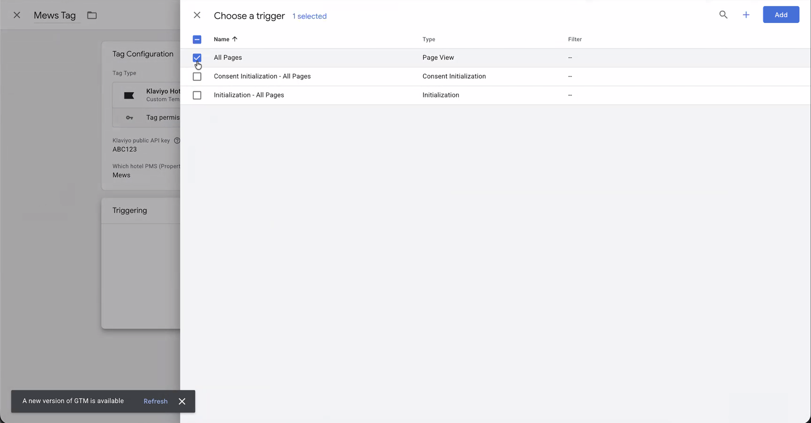 Klaviyo 호텔 트래킹).태그 구성을 클릭하고 방금 추가한 Klaviyo 호텔 태그를 선택합니다.