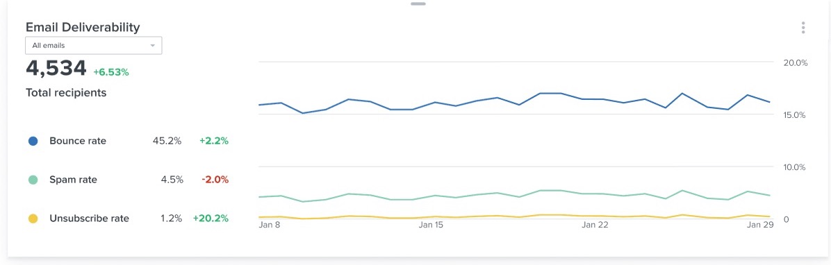이메일 전달 가능성 카드를 사용하면 전달 가능성을 모니터링하고 발신자 평판과 관련된 문제를 발견할 수 있습니다. 선택한 날짜 범위에서 반송, 스팸 및 수신 거부 비율을 검토하세요.