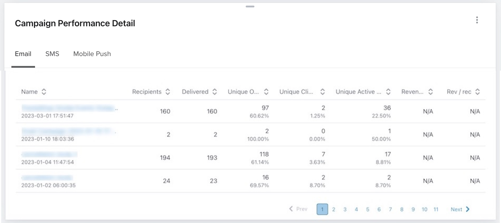 캠페인 성과 세부 정보 카드를 사용하면 전달, 참여, 전환 데이터를 포함한 보기를 통해 각 캠페인의 개별 성과를 자세히 살펴볼 수 있습니다. 여기에서 선택한 날짜 범위 내에서 최근에 보낸 모든 캠페인의 표가 표시됩니다.