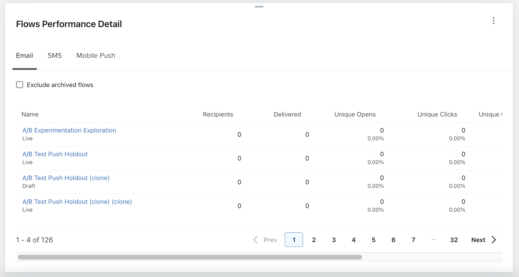 모든 이메일 플로우, 모든 SMS 플로우 또는 모든 모바일 푸시 플로우드롭다운을 열면 모든 플로우 또는 특정 플로우를 표시하여 보기를 더욱 세분화할 수 있습니다. 이 드롭다운 옆에 있는 초안 플로우 제외 확인란을 클릭하여 현재 초안 모드에 있는 모든 플로우를 데이터에 표시되지 않도록 제외할 수도 있습니다.